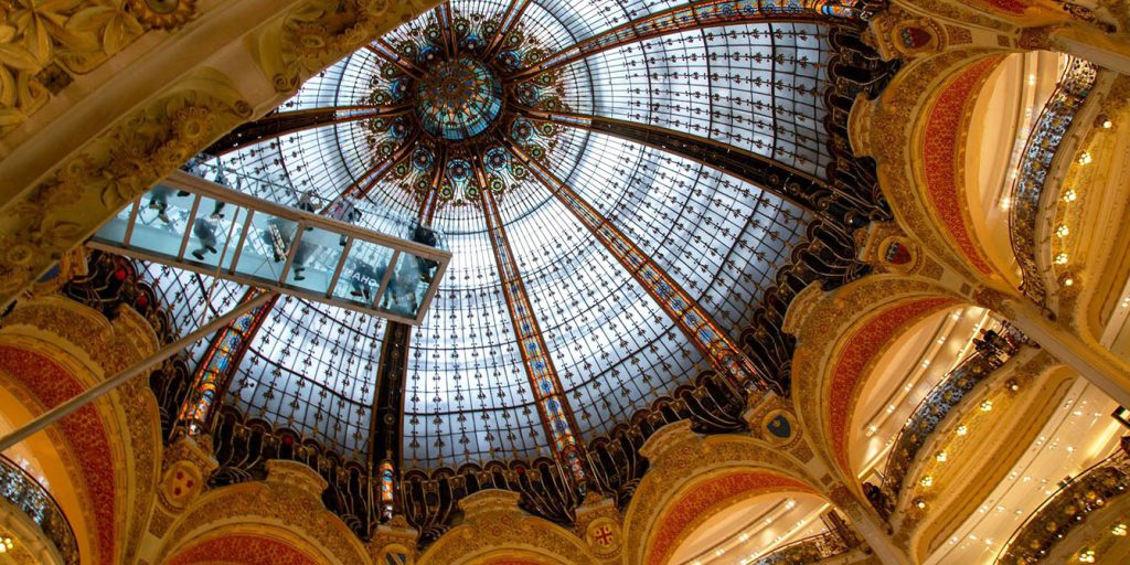 Zejdź spacerem w dół Pól Elizejskich (Avenue des Champs-Élysées) – najsłynniejszej alei świata. Następnie udaj się do słynnego domu towarowego Galeries Lafayette Haussmann. Warto zobaczyć jego imponującą kopułę. Koniecznie wejdź na dach Galeries Lafayette. Wejście jest bezpłatne i oferuje fantastyczne widoki na Paryż i Wieżę Eiffla.