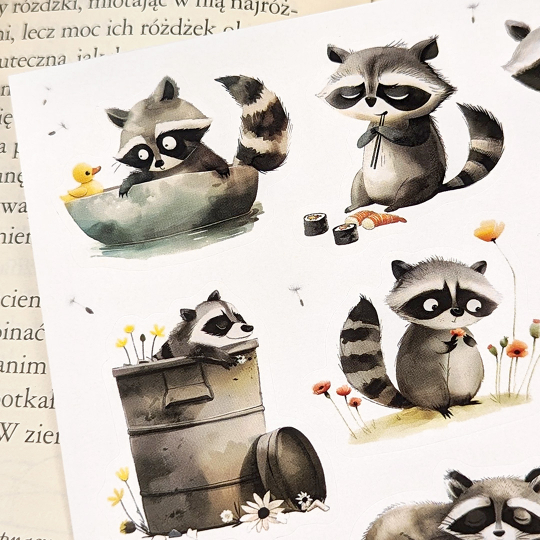 Naklejki z szopem praczem idealnie sprawdzą się do ożywienia notatek, zeszytów, planerów, a nawet laptopa. Świetnie się sprawdzą także do scrapbookingu lub bujo. To także unikalny pomysł na prezent dla każdego miłośnika zwierząt.