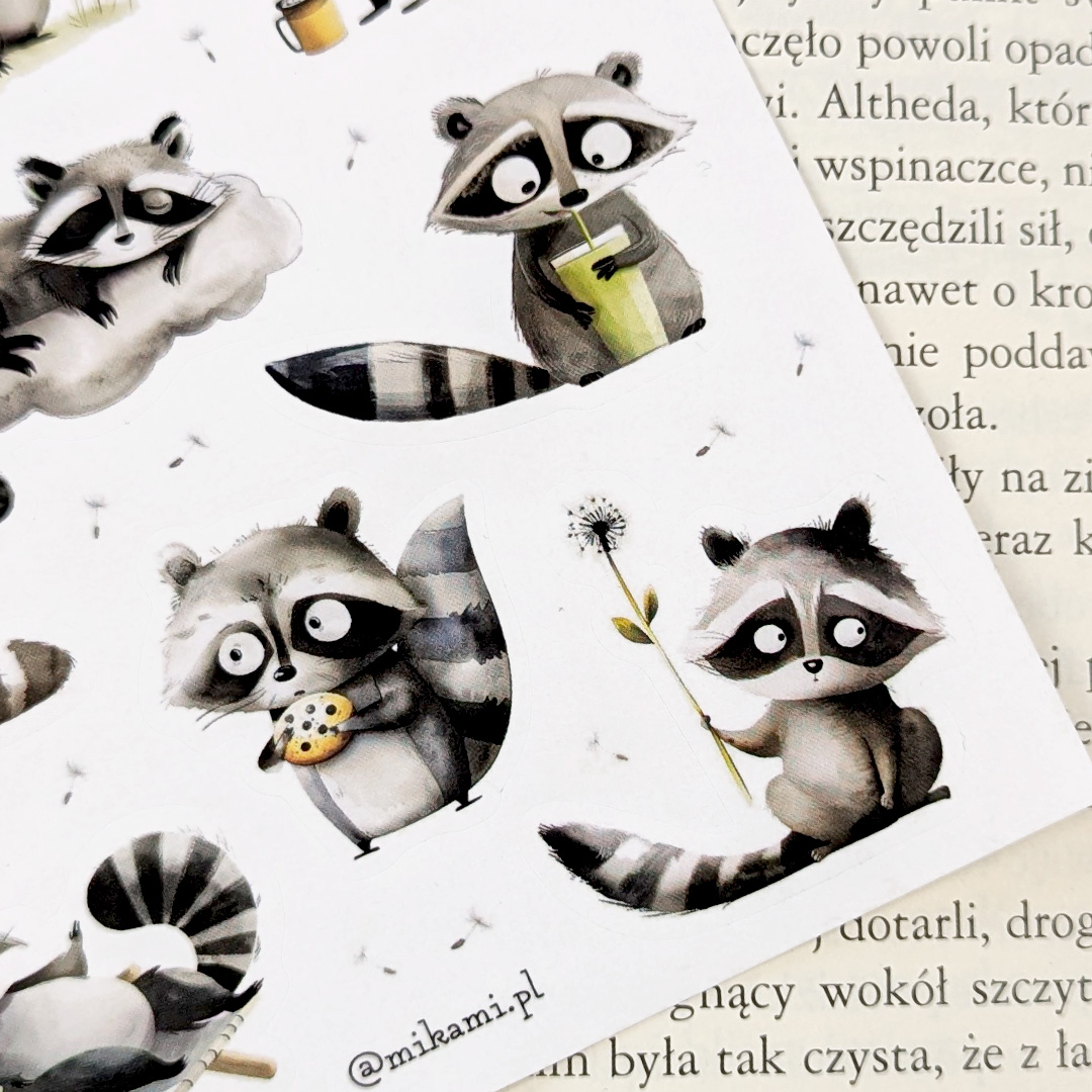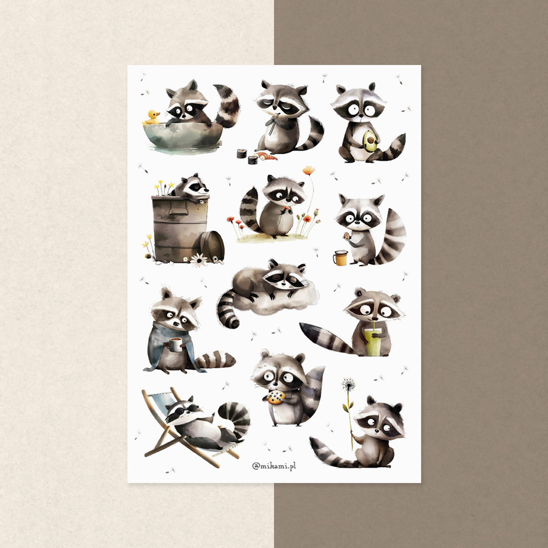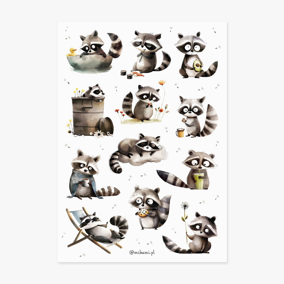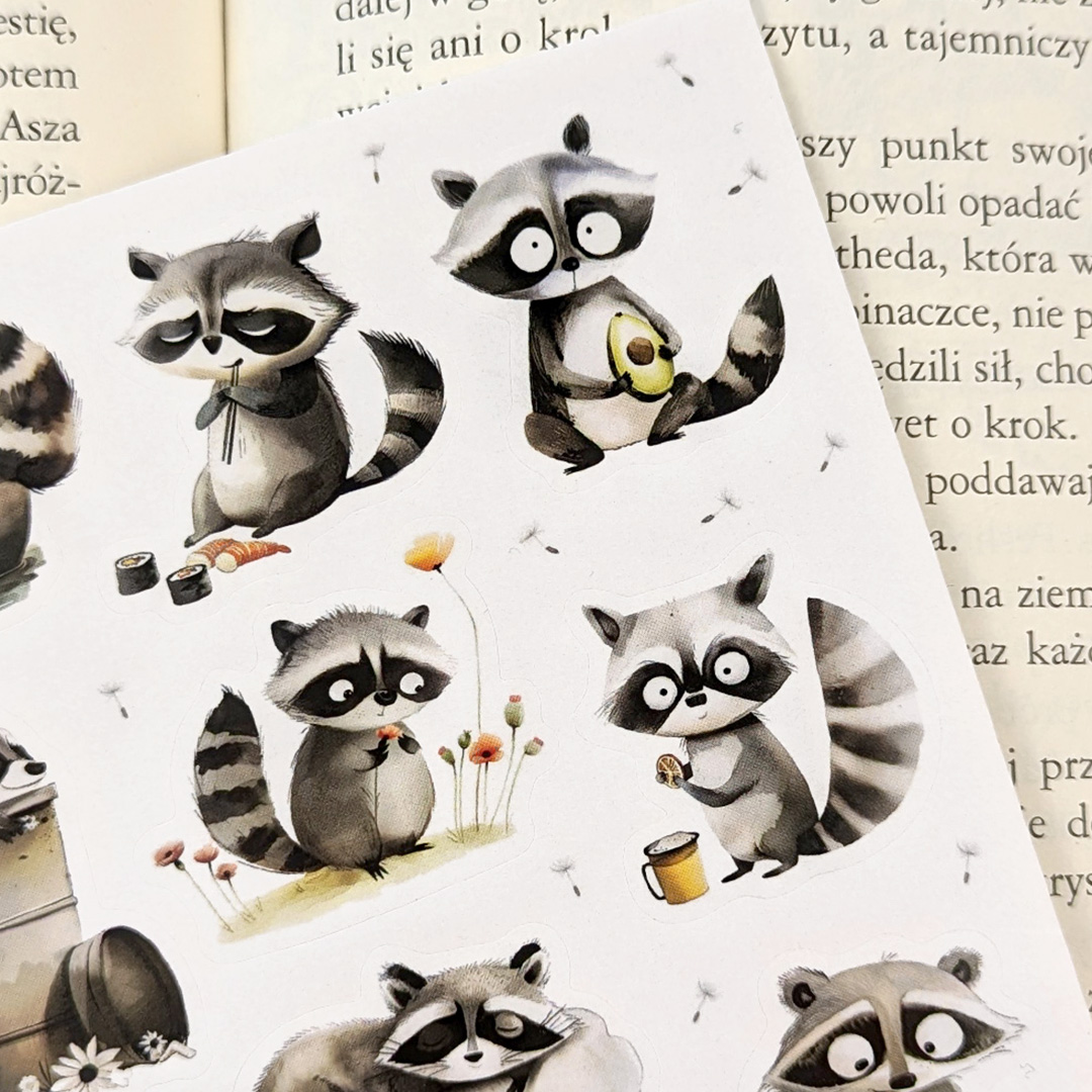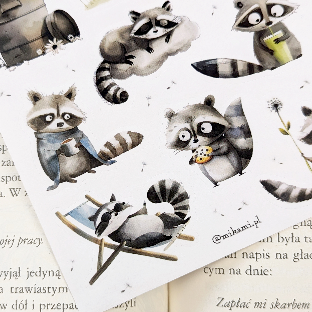 - 12 naklejek z szopem praczem na arkuszu