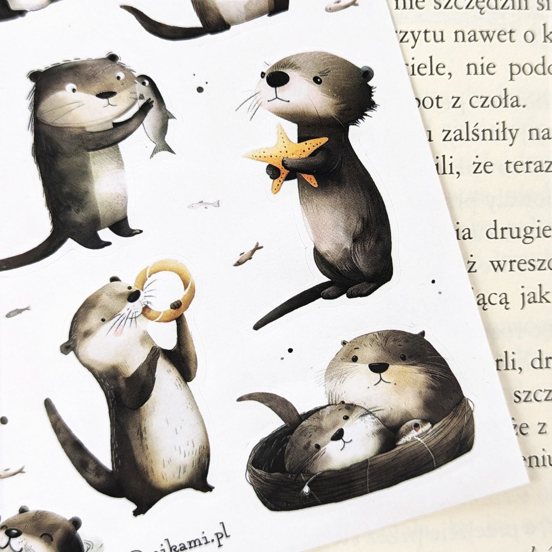 Naklejki z wydrami to oryginalne naklejki które dodadzą wodnego klimatu do różnych przedmiotów. Motywy takie jak bawiące się wydry, pływające na plecach, ciekawskie, z jedzeniem lub śpiące, wprowadzą odrobinę radości i beztroski. Naklejki są wykonane z papieru, pokryte laminatem matowym, co zapewnia elegancki wygląd, trwałość oraz odporność na odblaski.